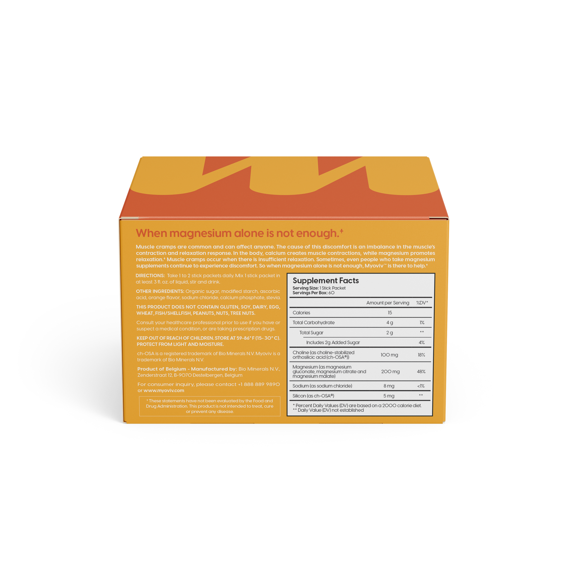 Myoviv™ is more than magnesium. Each orange-flavored sachet combines highly absorbable organic magnesium with choline-stabilized orthosilicic acid to support muscle and nerve health more completely. With superior absorption, great tolerability, and a taste you’ll love, Myoviv™ makes daily compliance simple. Safe for pregnancy and breastfeeding, it’s the smarter choice to help stop leg cramps and restore balance.†